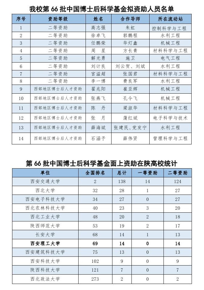 近日,中国博士后科学基金第66批面上资助拟资助人员名单公示,我校高志强等14位博士后获得资助,其中入选自然学科二等资助8人,“西部地区博士后人才资助计划”6人,获批数量位列全国69位,资助到款金额109万元。